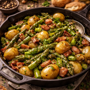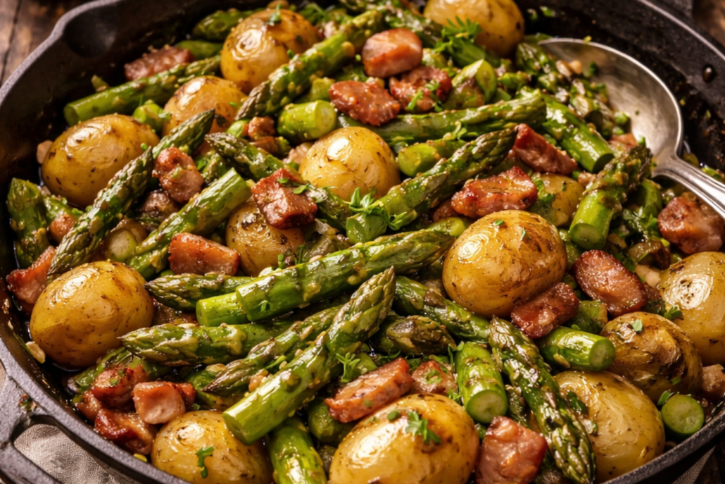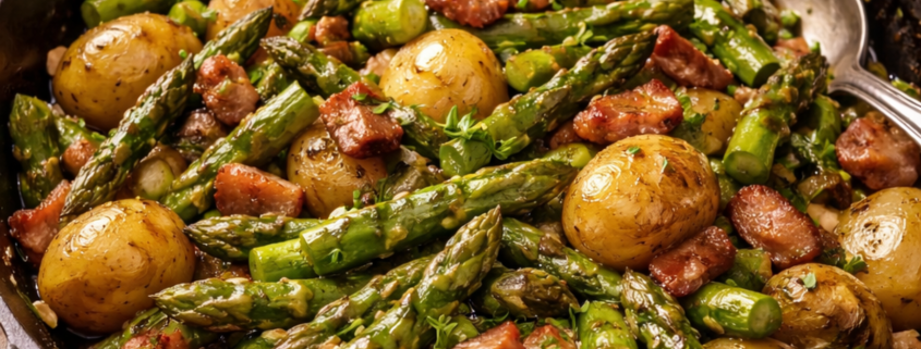 Poêlée rustique d’asperges vertes, pommes de terre grenaille & lard paysan